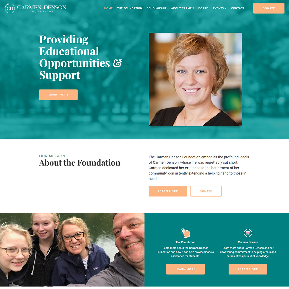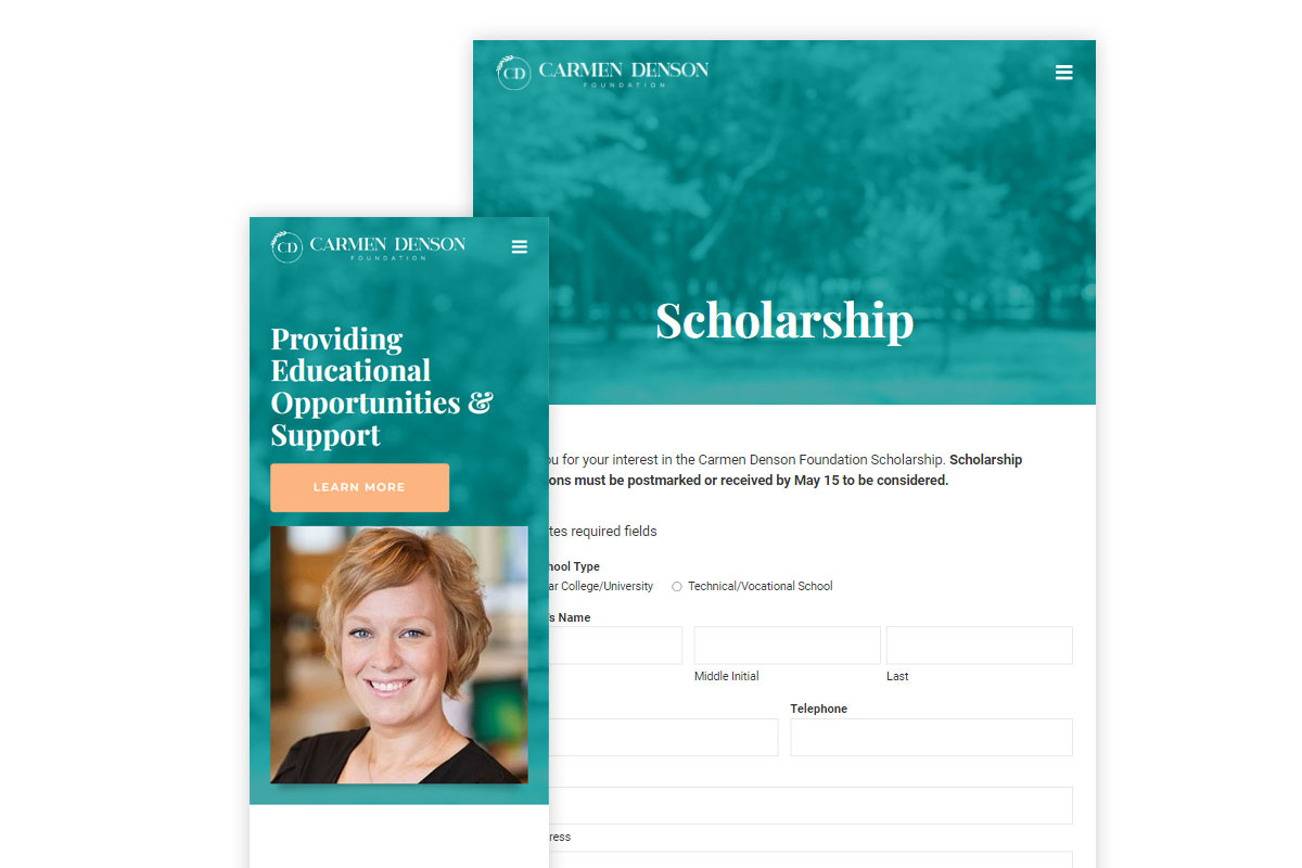 Carmen Denson, a deeply inspiring individual who has sadly passed, was renowned for her unwavering dedication to assisting others. When tasked with designing The Carmen Denson Foundation website, the objective was to provide a platform for exceptional students seeking financial aid for their continuing education. In tribute to Carmen's spirit, I designed a website imbued with the same uplifting essence she embodied, applying teal as the primary color and complementing it with subtle accents of pale orange. For the logo, I seamlessly blended academic elements with chic aesthetics, resulting in a sleek, contemporary design. The result is an elegant yet modern representation that pays homage to Carmen's enduring legacy.